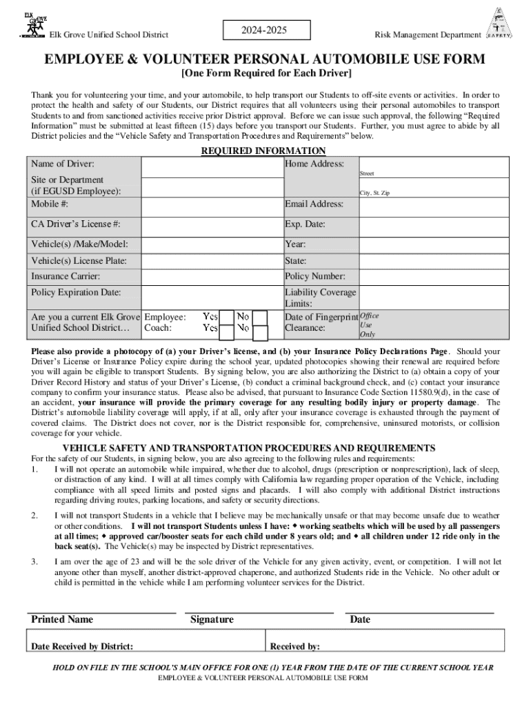Este formulario es requerido para que los empleados y voluntarios del Distrito Escolar Unificado de Elk Grove puedan utilizar sus automviles personales para transportar estudiantes a actividades fuera
