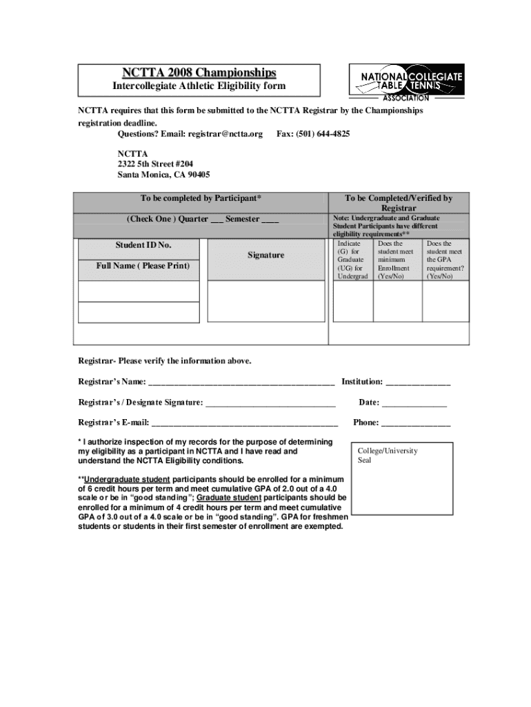The NCTTA 2008 Championships involved several key forms, including the Singles Registration Form, Doubles Registration Form, and Team Registration Form. Each form had distinct requirements, which participants needed to understand thoroughly. To facilitate the process, the forms were available in an easily accessible online format through pdfFiller, enabling participants to download, complete, and submit their forms conveniently.