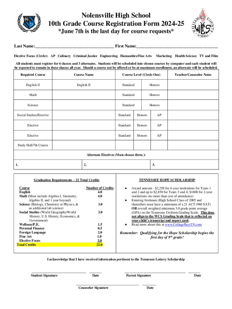 Get the free Nolensville High School 10th Grade Course Registration Form 2024-25