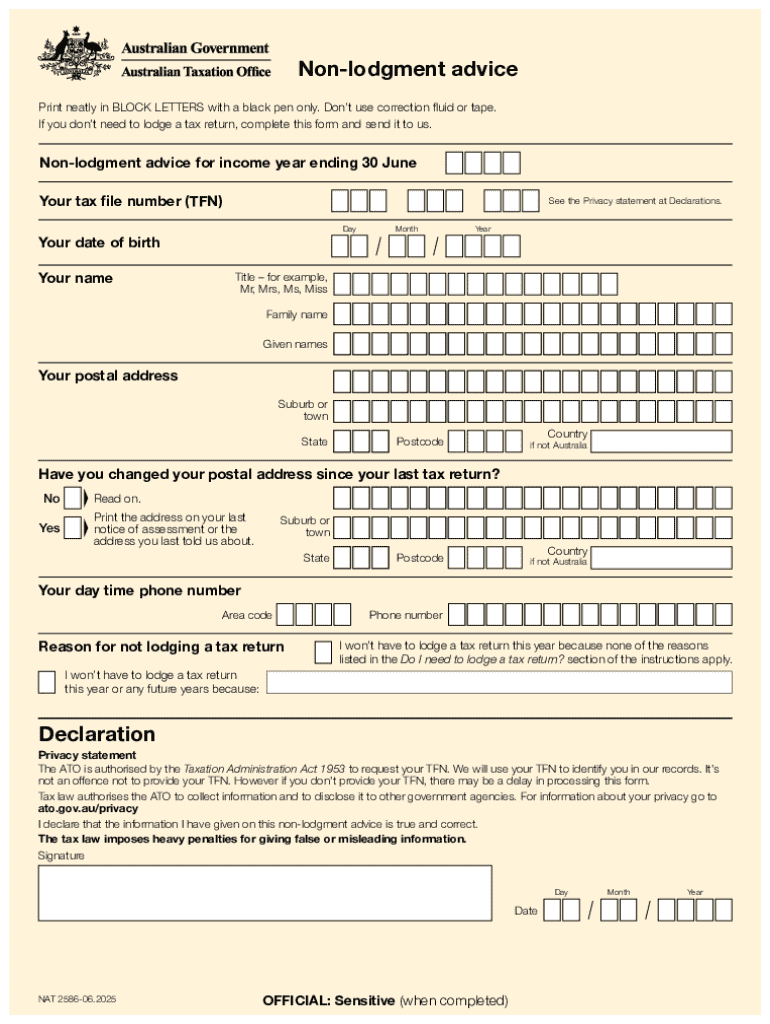 The importance of non-lodgment advice in tax reporting lies in its ability to clarify an individual's tax status. It ensures that taxpayers are aware of their obligations and helps manage expectations regarding their tax affairs. This form should be submitted in situations where income thresholds are not met or when specific circumstances impact a taxpayer's ability to lodge a return.