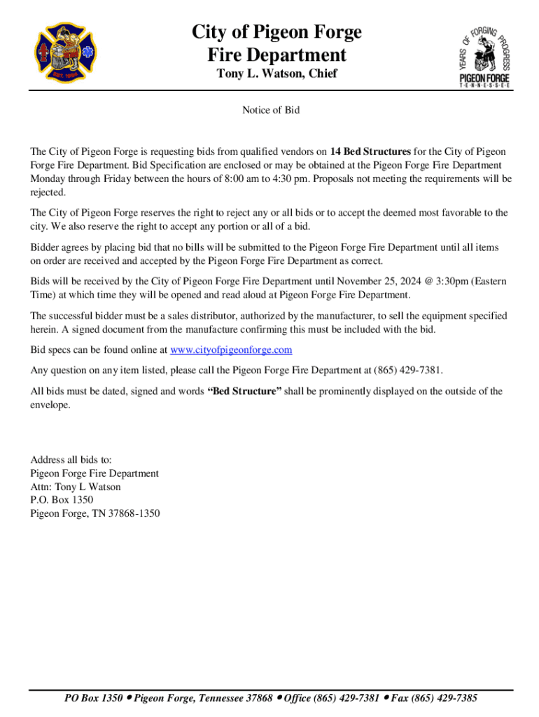The document is a notice from the City of Pigeon Forge Fire Department seeking bids for the supply of 14 bed structures, detailing specifications, submission guidelines, and the legal rights involved