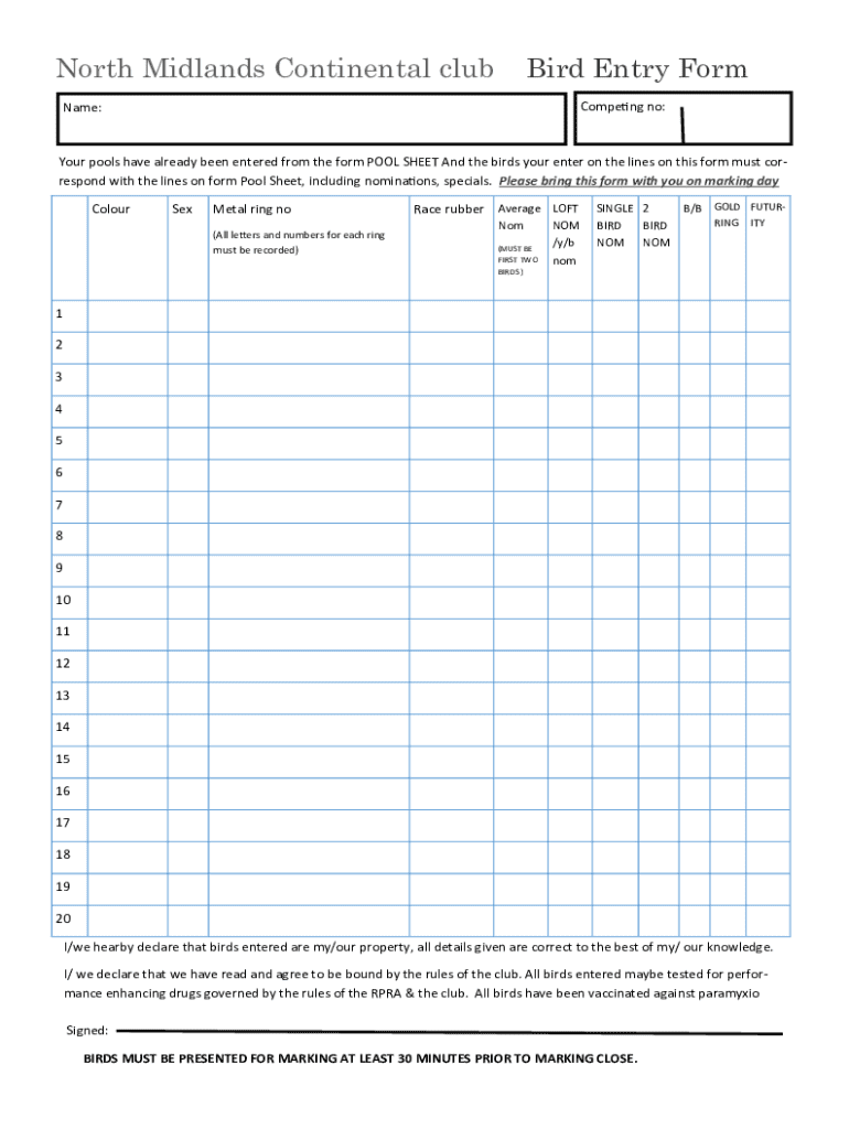 Get the free North Midlands Continental Club Bird Entry Form