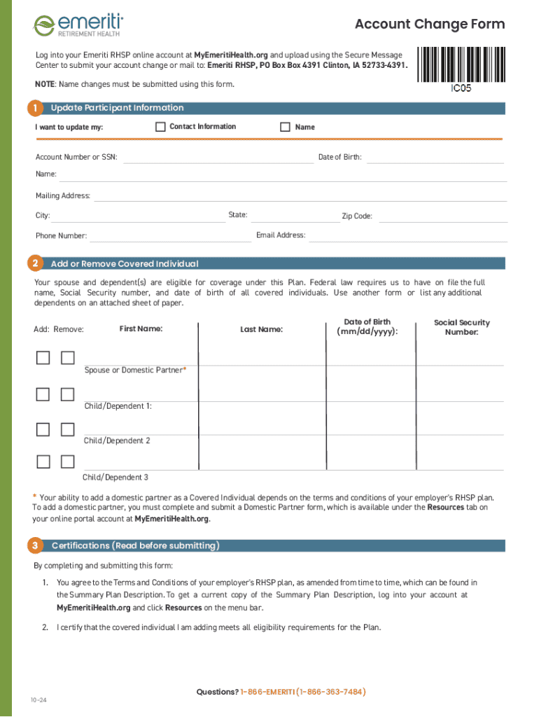 This form is used to request changes to participant account information, including updates to personal details and adding or removing covered individuals under the Emeriti RHSP plan.