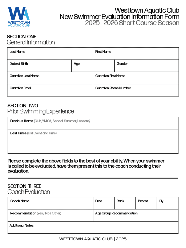 The new swimmer evaluation information form is structured to collect a comprehensive range of data that paints a thorough picture of the swimmer. It includes the following key components: