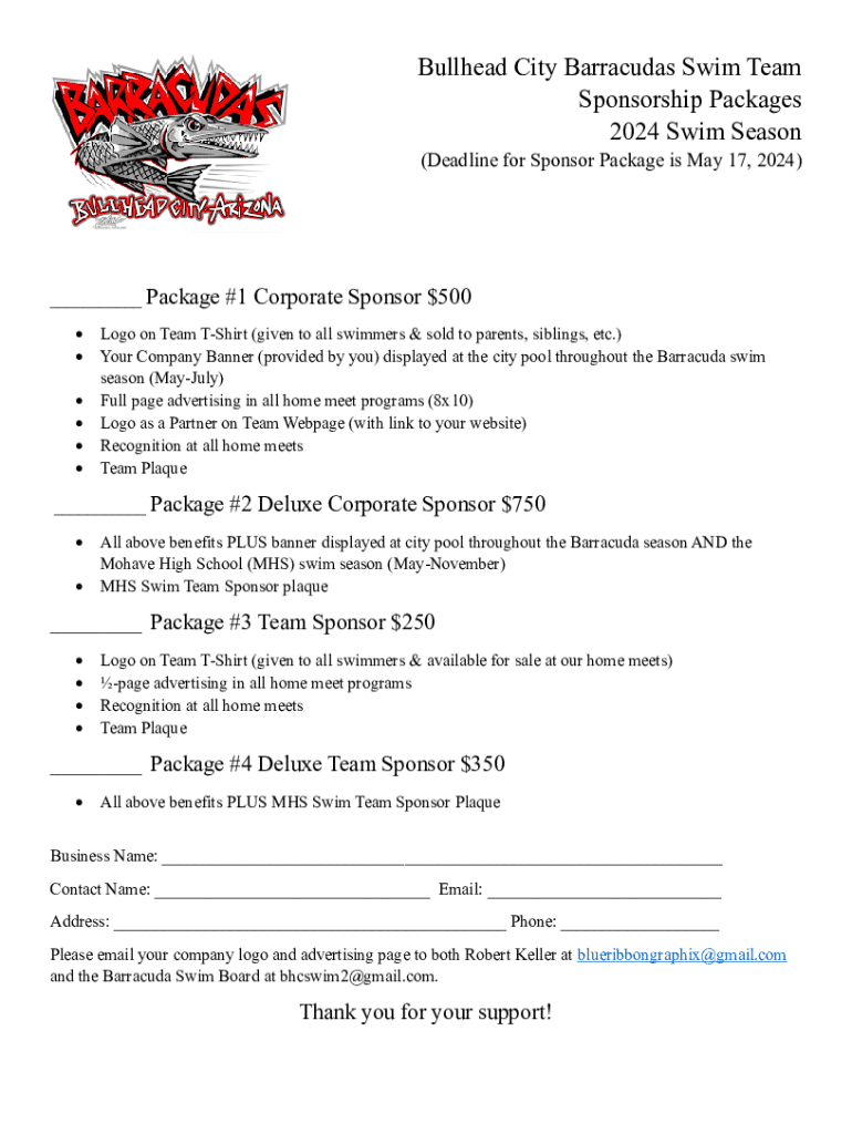 Get the free Bullhead City Barracudas Swim Team Sponsorship Packages