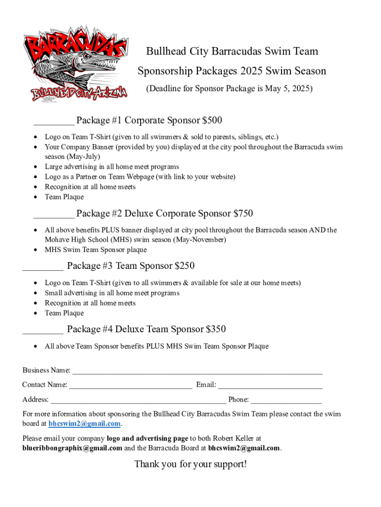 Get the free Bullhead City Barracudas Swim Team Sponsorship Packages
