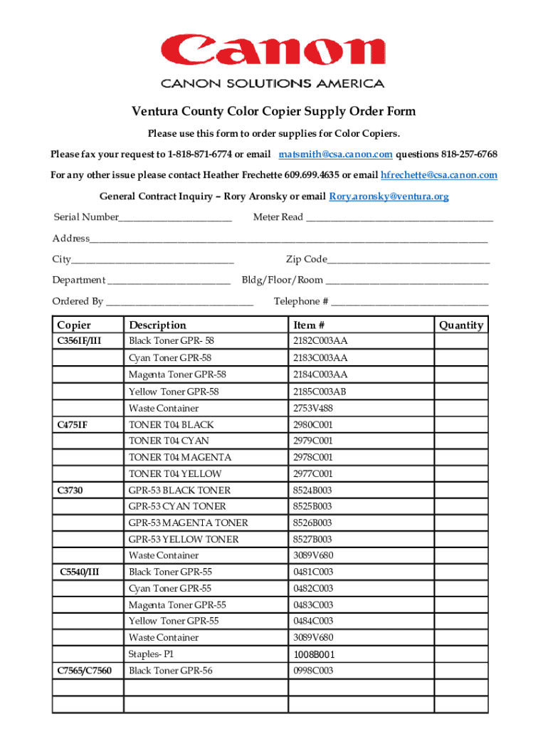 The Ventura County color copier form is a vital document designed to assist residents and organizations in efficiently managing their color printing needs across various county departments. This form streamlines the process of requesting color copying services, making it essential for anyone looking to produce colorful materials for presentations, reports, or community events. Its importance lies in its role as a standardized tool that facilitates communication between individuals and county services, ensuring that requests are clear and properly documented.