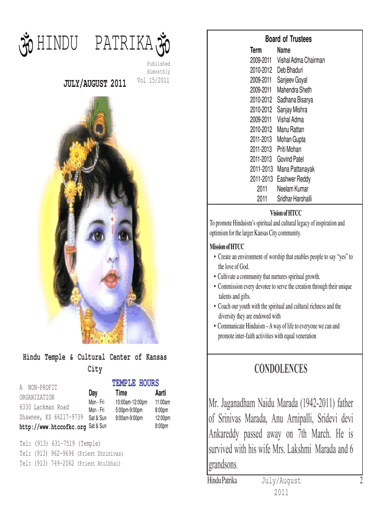 HINDU PAPRIKA Board of Trustees Term 20092011 20102012 20092011 20092011 20102012 20102012 20092011 20102012 20112013 20112013 20112013 20112013 20112013 2011 2011 Published Bimonthly JULY/AUGUST