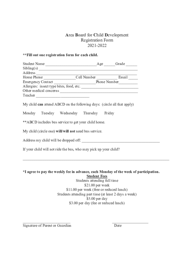 This registration form is intended for parents or guardians to register their children for the ABCD program, including information on fees, responsibilities, travel authorization, and guidelines for