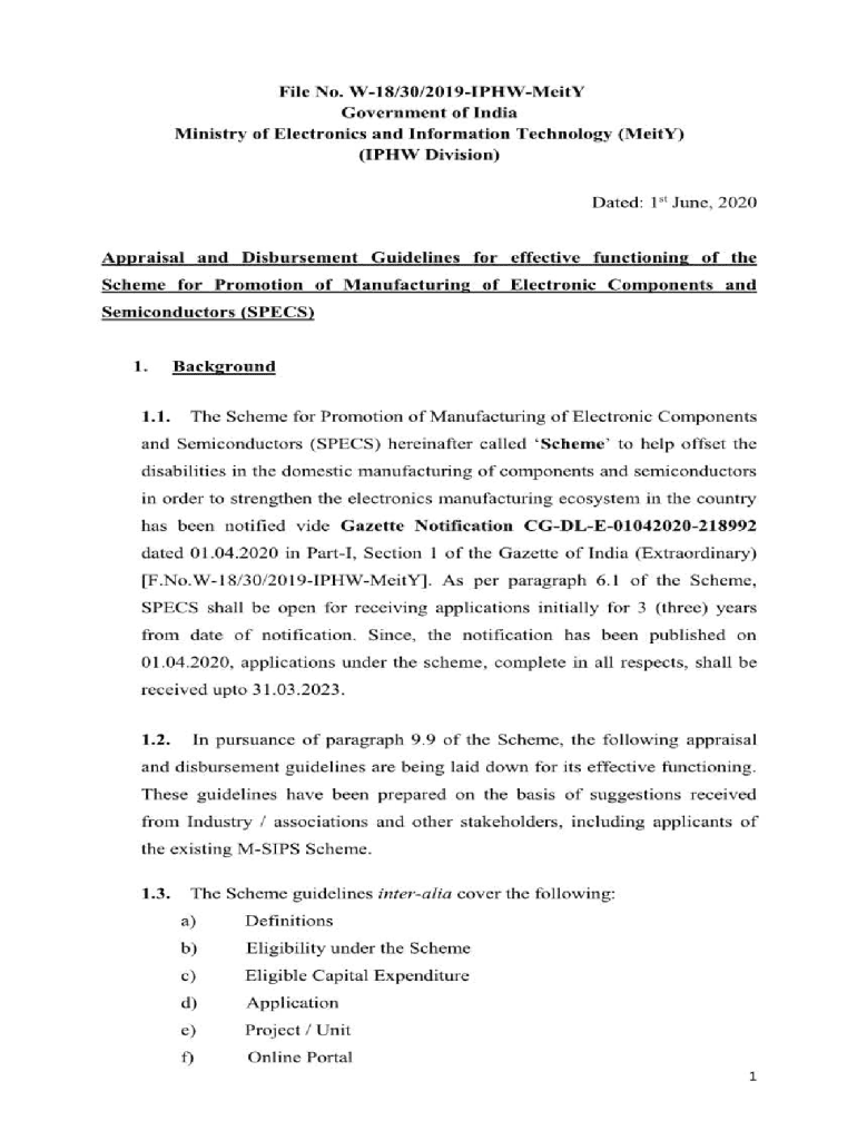 These guidelines outline the procedures and requirements for the effective functioning of the Scheme for Promotion of Manufacturing of Electronic Components and Semiconductors (SPECS) in India, including