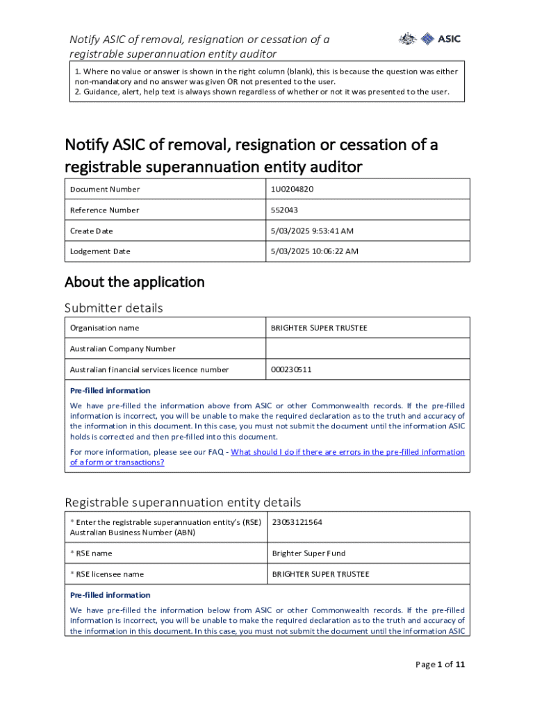 Get the free Notify Asic of Removal, Resignation or Cessation of a Registrable Superannuation Ent...