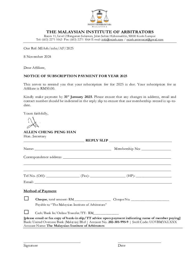 Get the free Notice of Subscription Payment for Year 2025 & Exemption From Payment