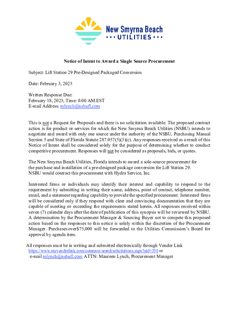 This document serves as a notice of intent to award a single source procurement for the purchase and installation of a predesigned package conversion for Lift Station 29 by New Smyrna Beach Utilities.
