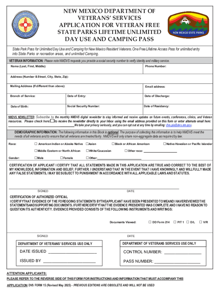 Get the New Mexico Department of Veterans’ Services Application for Veteran Free State Parks Life...