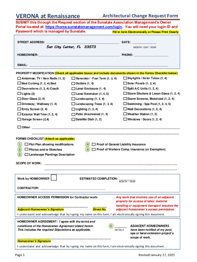 This document serves as a formal request for homeowners to propose modifications or changes to their properties, which must be submitted for approval to the Verona at Renaissance HOA Board of Directors.