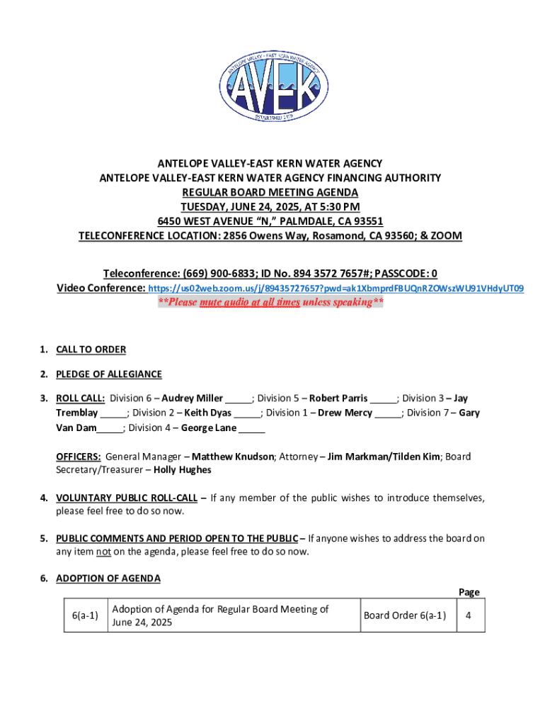 Get the free Antelope Valley-east Kern Water Agency Regular Board Meeting Agenda