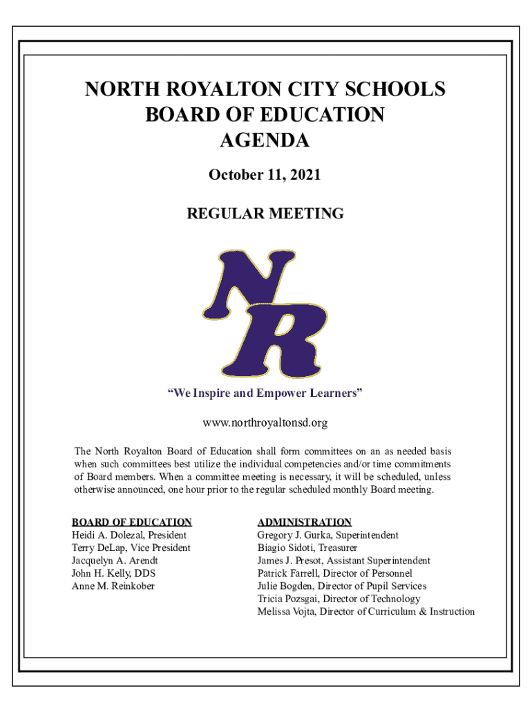 Get the free North Royalton City Schools Board of Education Agenda