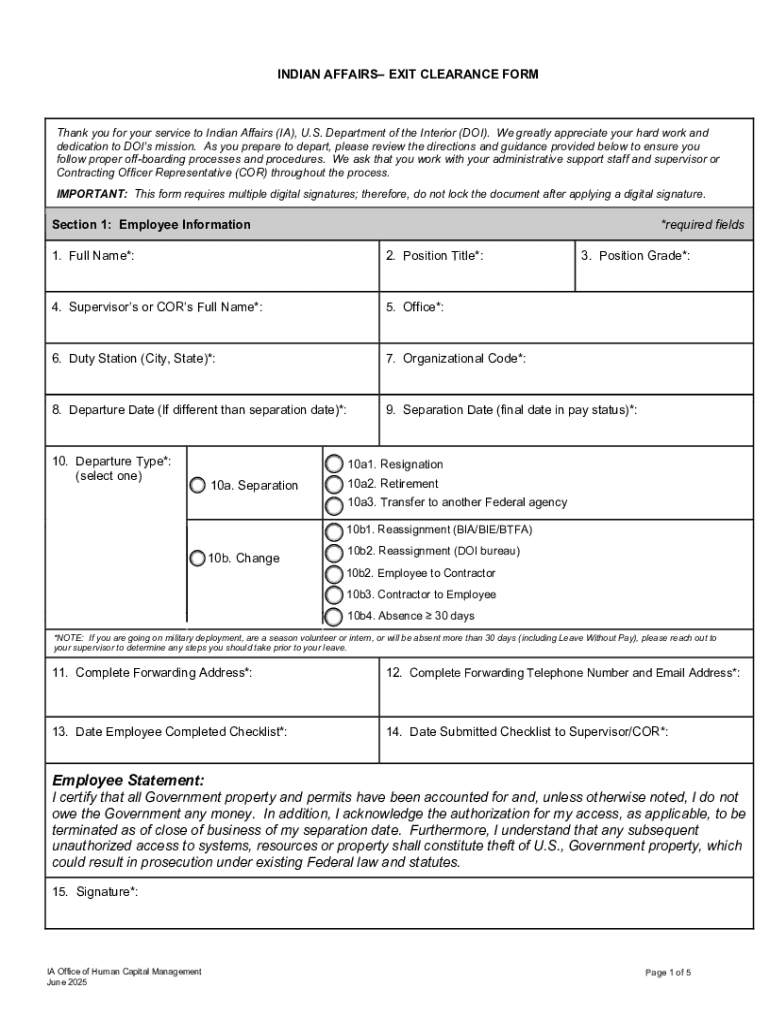 The Indian Affairs Exit Clearance Form is a crucial document required for individuals looking to exit their affiliation with Indian Affairs. This form serves multiple purposes, primarily providing a formal declaration of intent to leave and ensuring that all necessary clearances are completed before the exit process can officially commence. Correctly completing the form is of utmost importance to prevent any delays or complications during the transition.