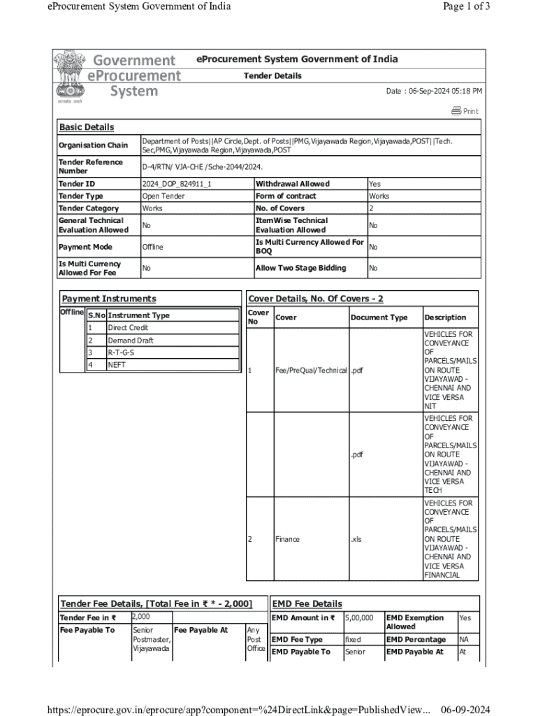 This document lays out the tender details and conditions for hiring commercial vehicles with drivers for transporting parcels and mails on the route between Vijayawada and Chennai.