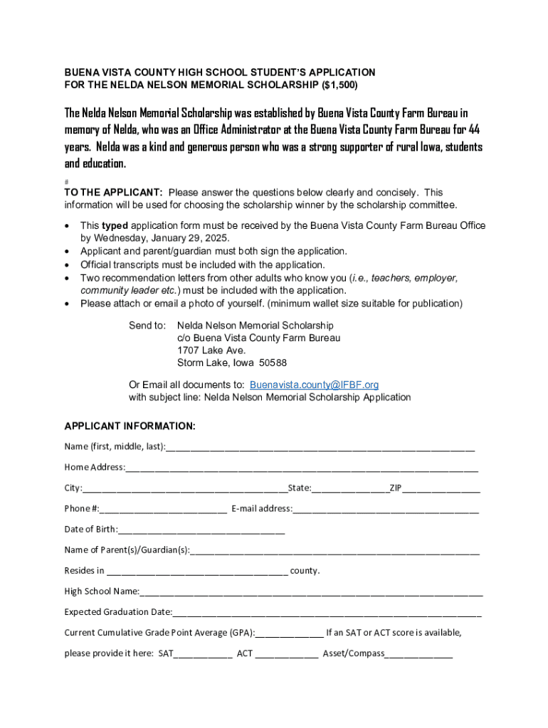 Get the free Buena Vista County High School Student’s Application for the Nelda Nelson Memorial S...