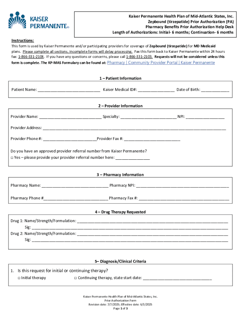 Get the free Kaiser Permanente Zepbound Prior Authorization Form