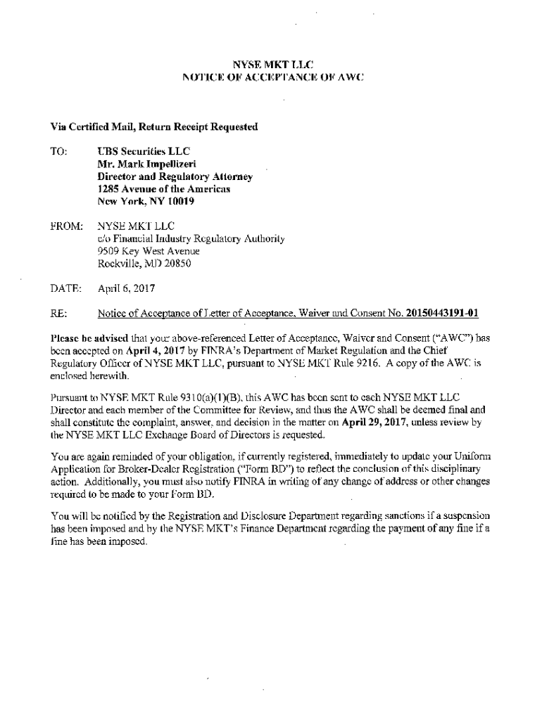 Get the free NYSE MKT LLC NOTICE OF ACCEPTANCE OF AWC Via ...