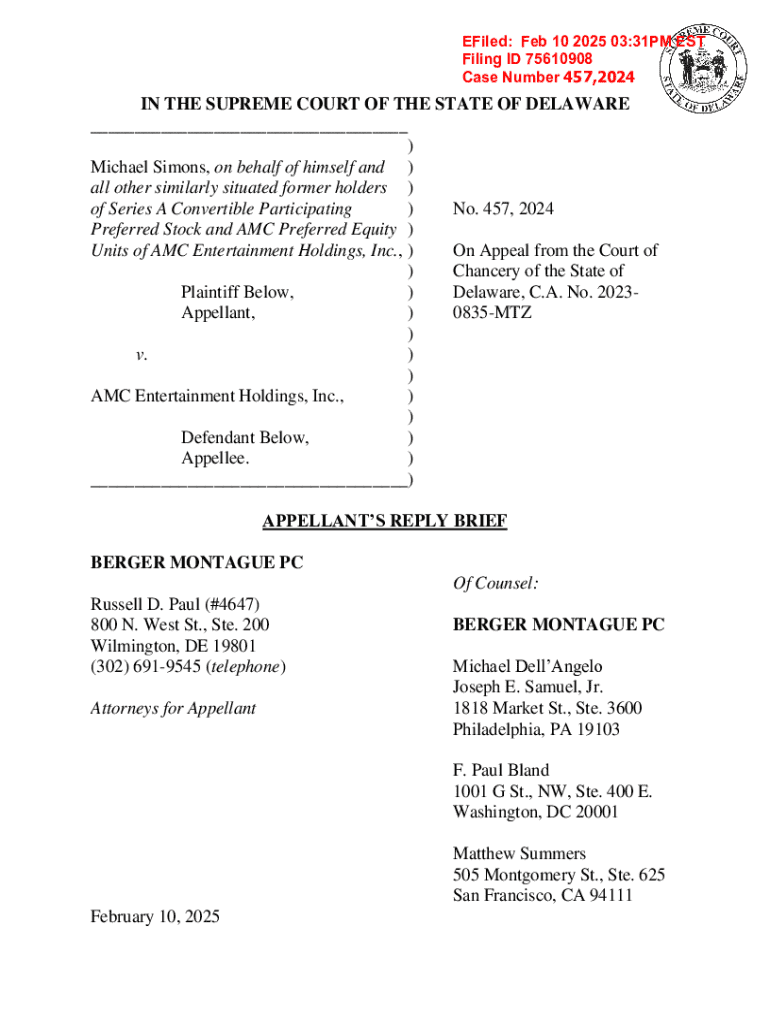 This document is the appellant\'s reply brief submitted in the Supreme Court of the State of Delaware concerning a case involving Michael Simons and AMC Entertainment Holdings, Inc., focusing on preferred