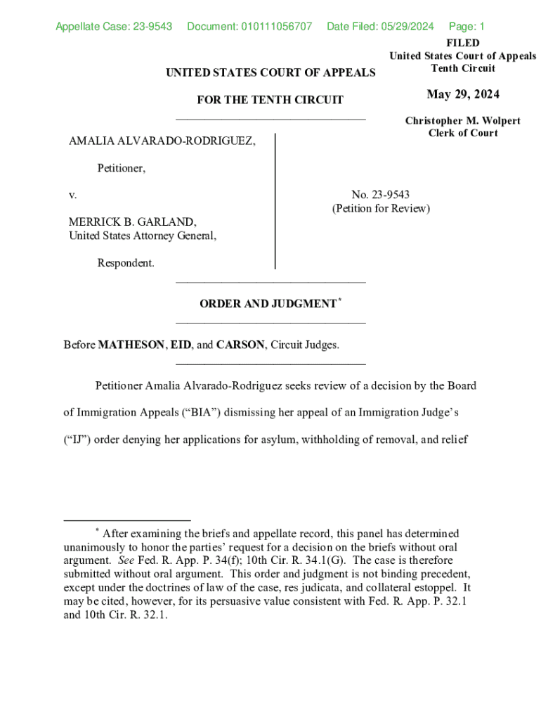 This document is an order and judgment from the United States Court of Appeals for the Tenth Circuit regarding Amalia AlvaradoRodriguez\'s petition for review of a decision by the Board of Immigration