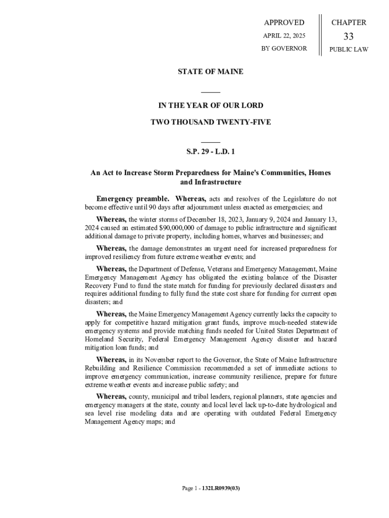 This document is a public law enacted by the Governor of Maine to address the urgent need for increased storm preparedness due to significant damage from recent winter storms. It establishes programs