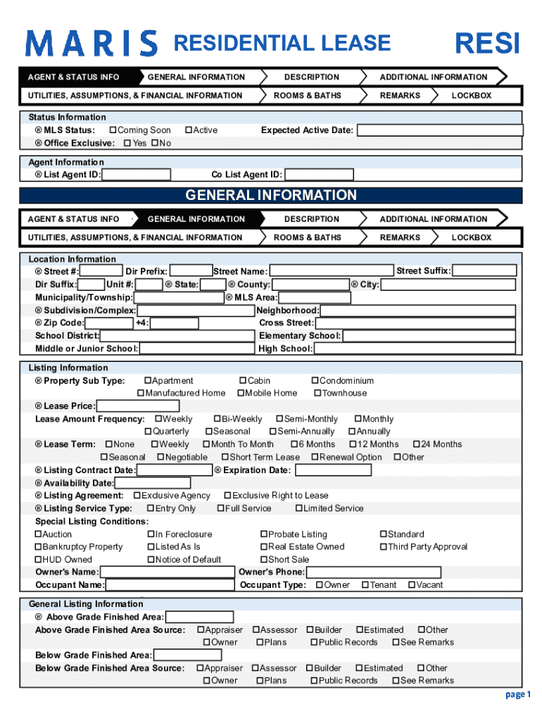 This document outlines the details of a residential lease including information about the property, utilities, financial data, and room descriptions.