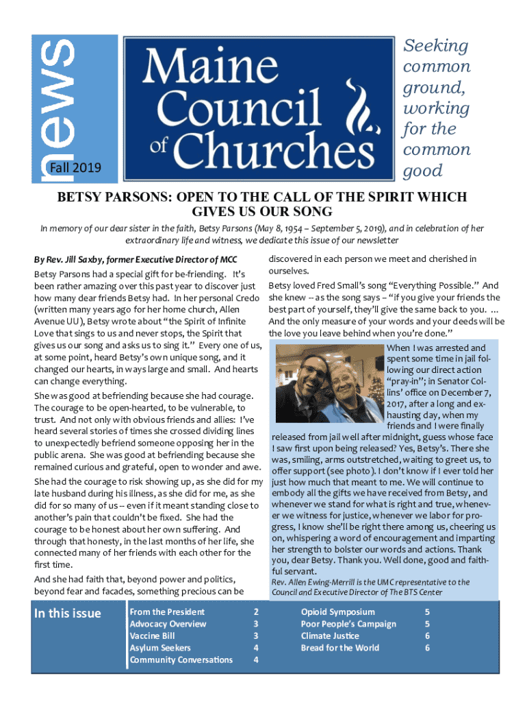 This newsletter discusses the life of Betsy Parsons, advocacy initiatives by the Maine Council of Churches, issues concerning asylum seekers, health crises like opioid use and vaccine acceptance,