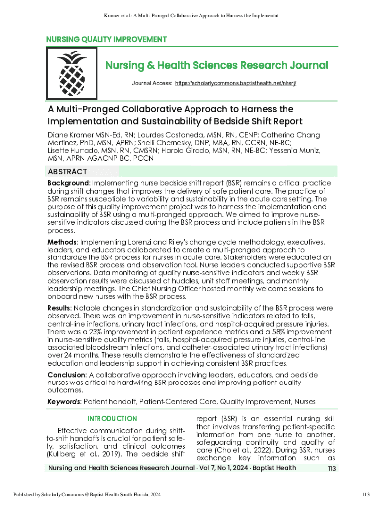 This document presents a quality improvement project that focuses on implementing and sustaining the bedside shift report (BSR) in an acute care setting. It details a collaborative approach that includes
