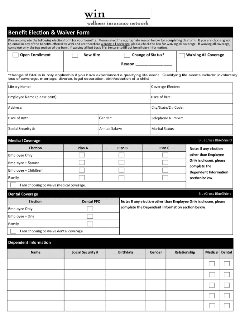 Get the free Benefit Election & Waiver Form