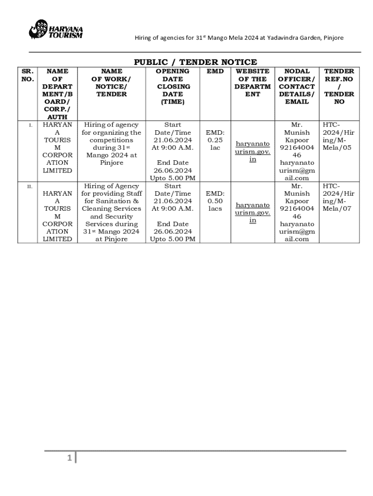 Get the free Hiring of Agencies for 31st Mango Mela 2024 at Yadavindra Garden, Pinjore - haryanat...