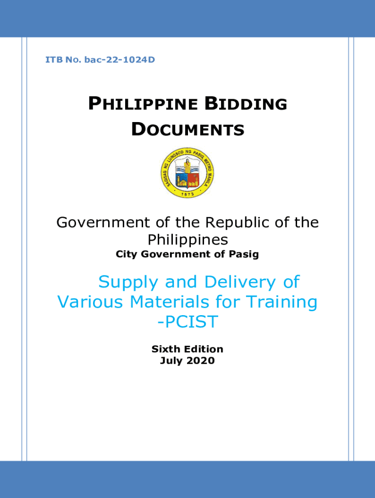 This document serves as the bidding guidelines for the Supply and Delivery of Various Materials for TrainingPCIST under the City Government of Pasig, detailing eligibility requirements, procedures,