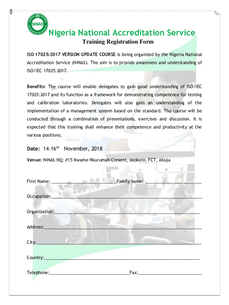 Get the free Nigeria National Accreditation Service Training Registration Form