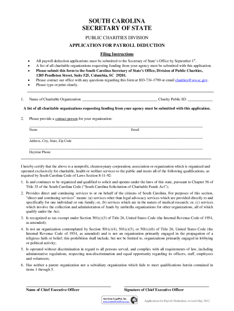 This document is an application form for payroll deduction for charitable organizations in South Carolina, including instructions for submission and certification requirements.