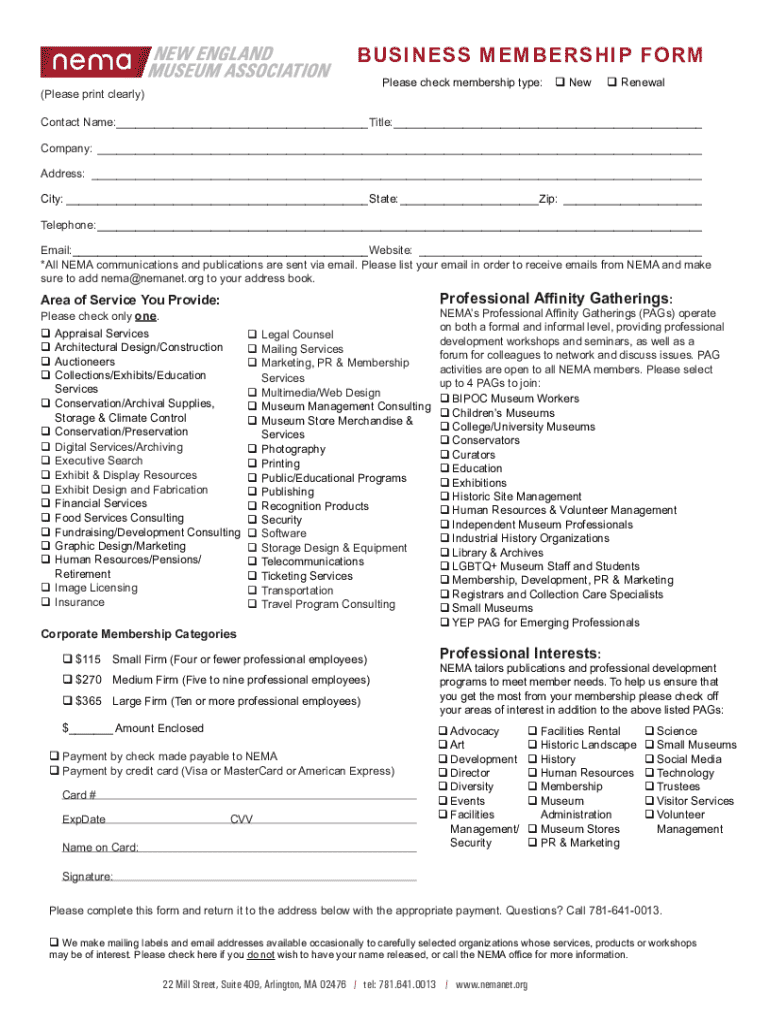 A business membership form is a document used by organizations to gather essential information from individuals or entities seeking membership. Its primary purpose is to facilitate the application process and ensure that all necessary data is collected systematically. Organizations depend on these forms to maintain updated records of their members and to outline the benefits associated with membership.