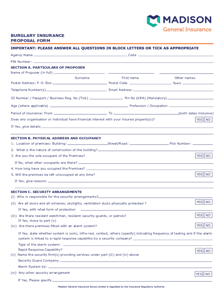 The necessity of a burglary insurance proposal form stems from its pivotal role in the application process. This form is where you document the specifics about your property and the coverage you're seeking. Properly completing this form not only enhances your chances of approval but also ensures that you receive adequate protection tailored to your needs.