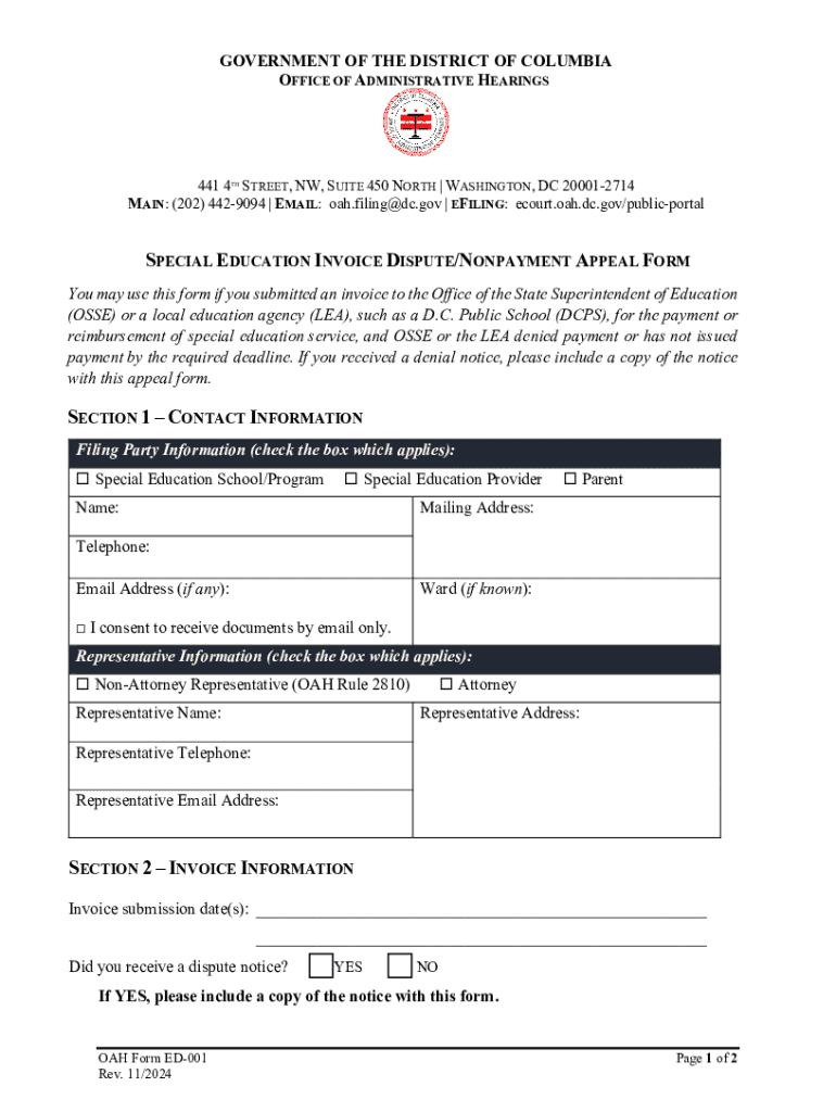This form is used to appeal a decision regarding nonpayment or dispute of an invoice submitted for special education services to the Office of the State Superintendent of Education or local education