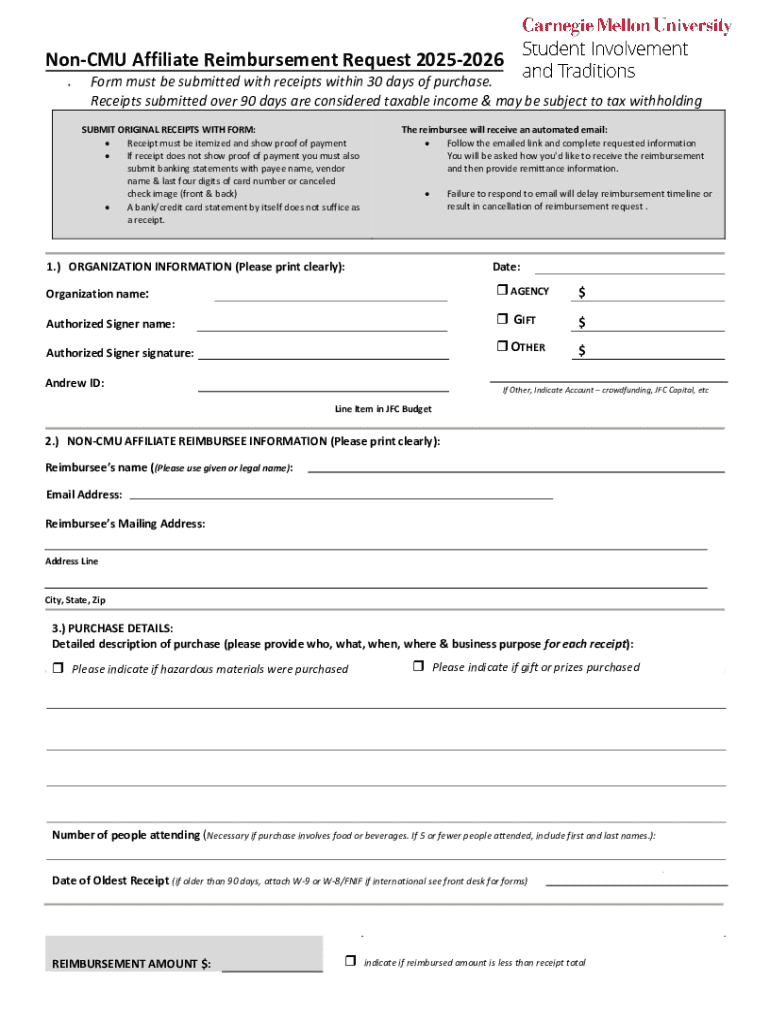 Get the free Non-cmu Affiliate Reimbursement Request 2025-2026