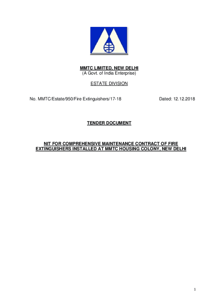 This document serves as a tender invitation for a comprehensive maintenance contract for fire extinguishers installed at MMTC Housing Colony, New Delhi. It outlines the requirements for bidders, including