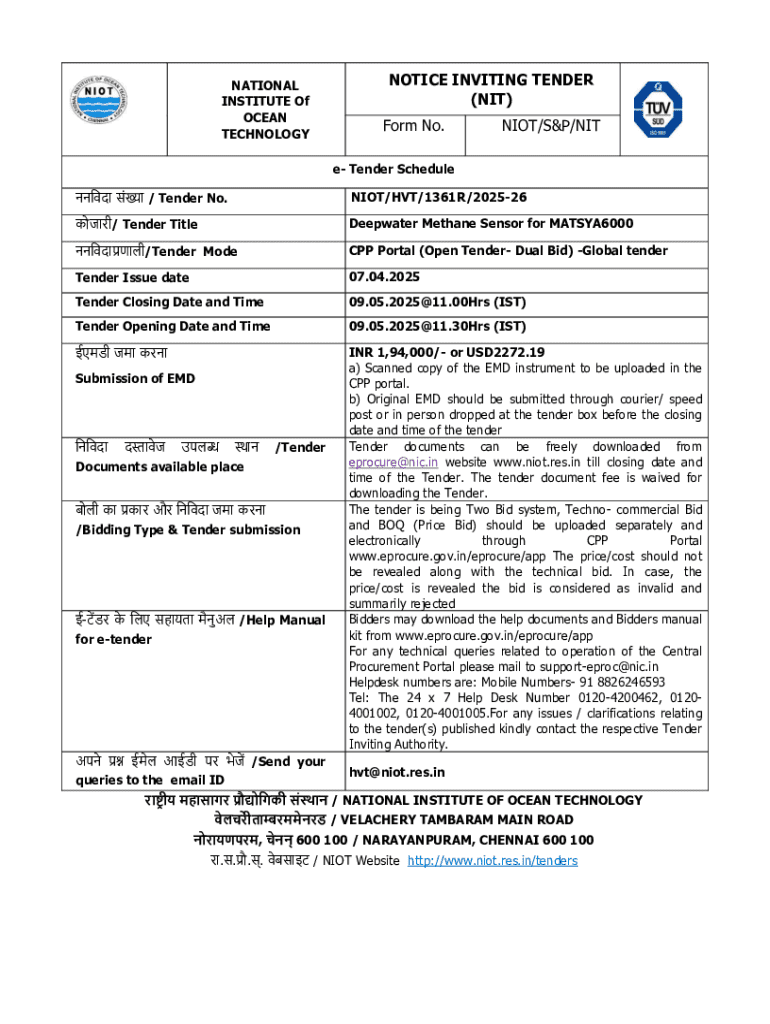 The document is an official notice inviting tenders for the supply of Deepwater Methane Sensors for MATSYA6000 by the National Institute of Ocean Technology. It provides detailed information regarding