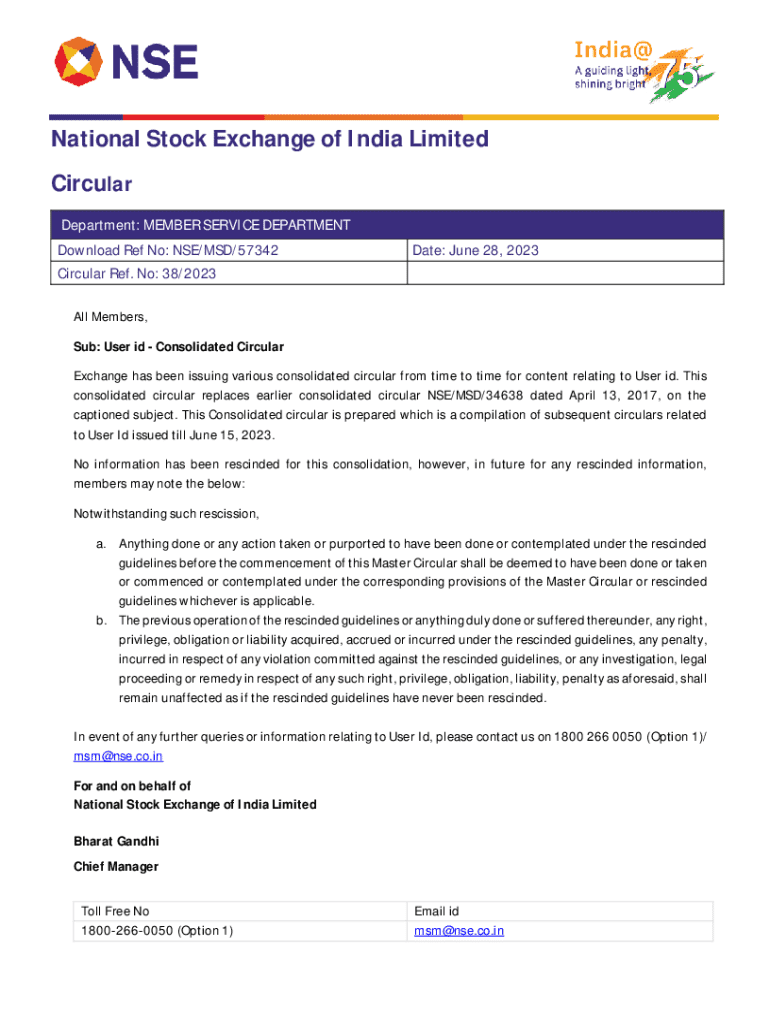 Get the free National Stock Exchange of India Limited - Consolidated Circular on User Id Request