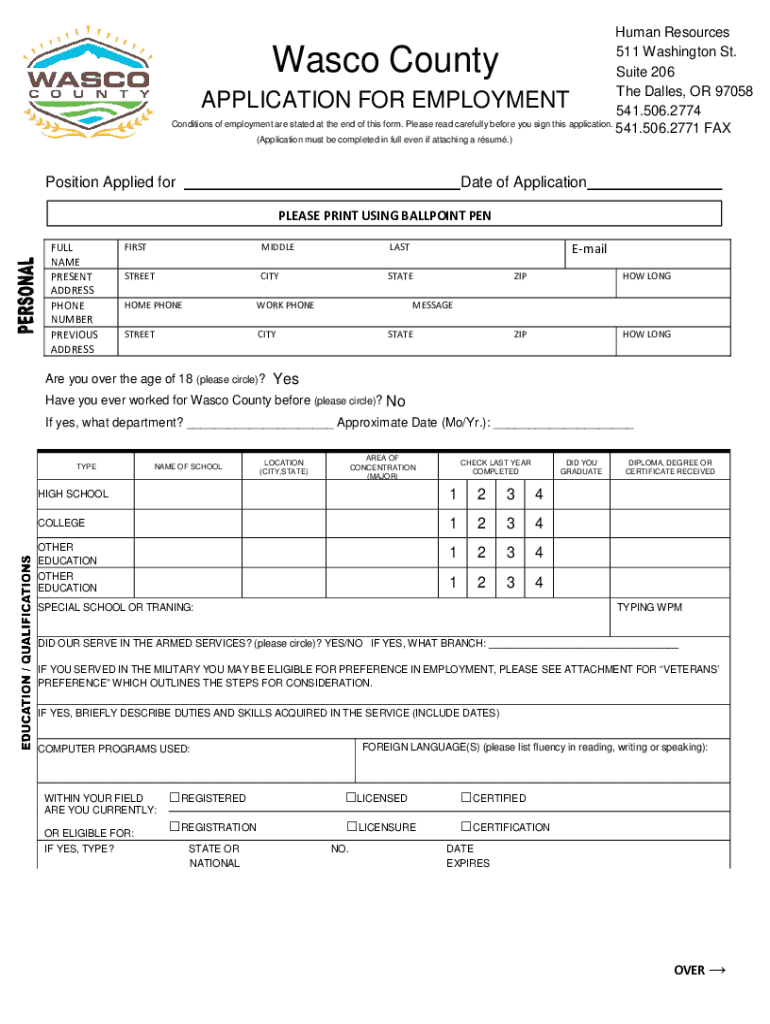 This document serves as an application form for employment with Wasco County, capturing personal, educational, and employment history for prospective candidates.