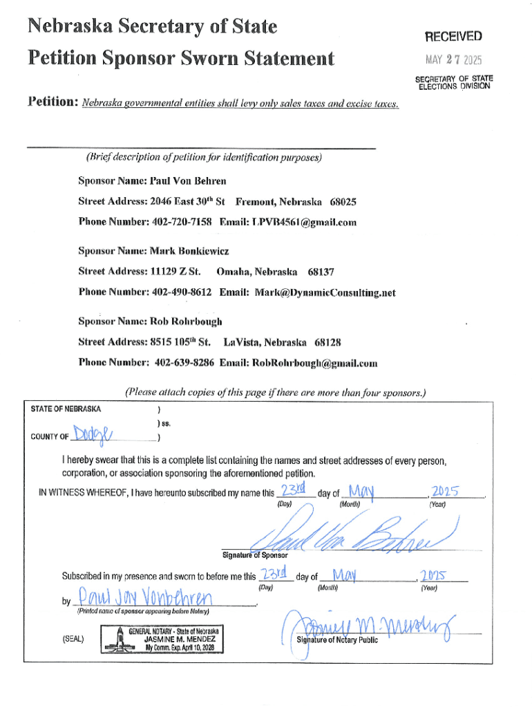 This document is a petition demanding the repeal of personal and real property taxes, personal and corporate income taxes, and inheritance taxes in Nebraska.