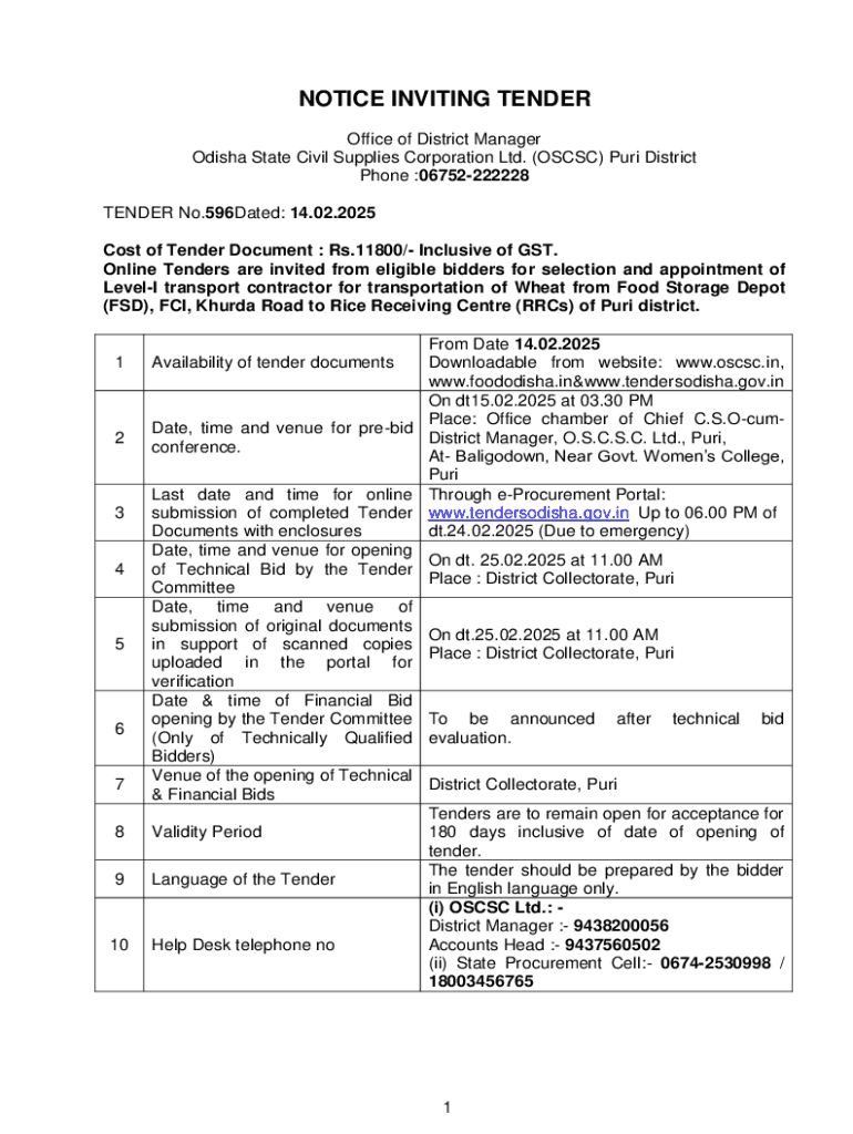 This document invites tenders for the appointment of LevelI transport contractor for the transportation of wheat from Food Storage Depot to Rice Receiving Centres in Puri district, Odisha.