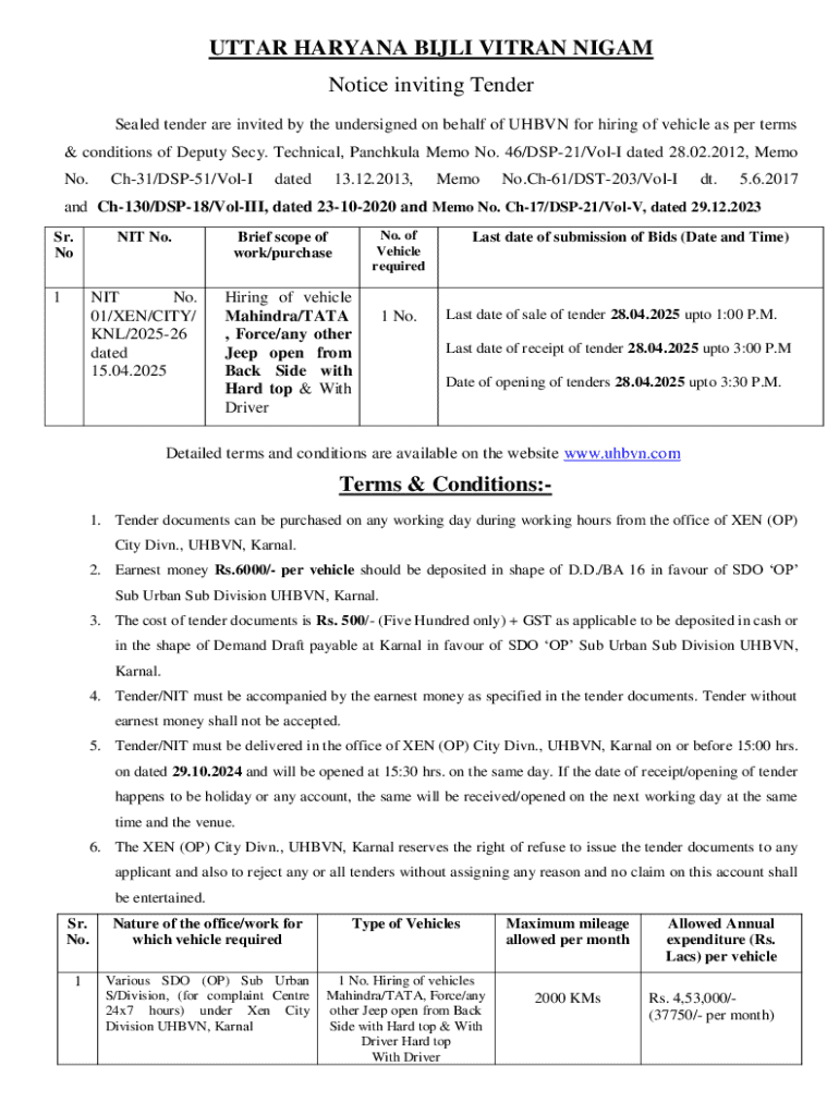 This document is a notice inviting tenders for hiring of a vehicle by UHBVN for the Complaint Centre (24x7) under various terms and conditions.