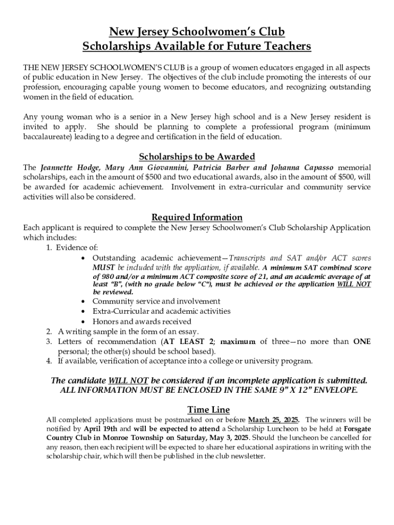 This document outlines the scholarship opportunities provided by the New Jersey Schoolwomen\'s Club for young women aspiring to become educators. It details the application process, required qualifications,