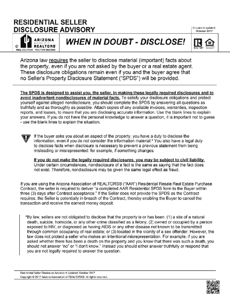 AZ Residential Sellers Property Disclosure Statement (SPDS) Form Versions